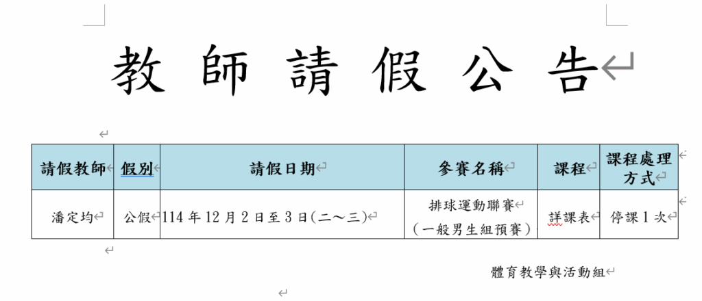 本組潘定均老師因帶隊出賽公假,比賽時間所授課程停課一次。