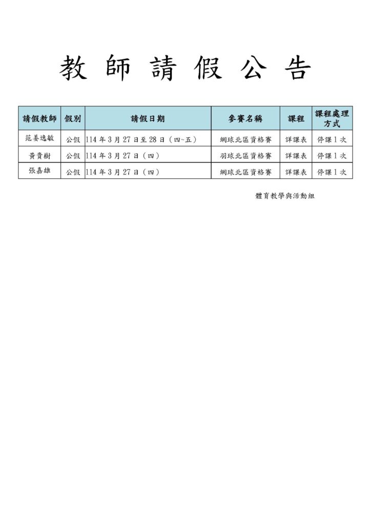 本組范姜逸敏教師、黃貴樹教師、蔡慧敏教師、張嘉雄教師教師因帶隊出賽公假,比賽時間所授課程停課一次。(詳附檔)
