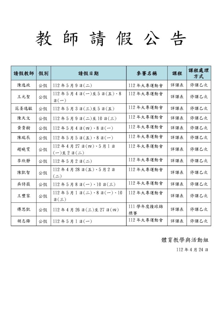 本組陳逸政教師、王元聖教師、范姜逸敏教師、陳天文教師、黃貴樹教師、陳瑞辰教師、趙曉雯教師、李欣靜教師、陳凱教師智、吳詩薇教師、王豐家教師、傅思凱教師、胡志鋒教師因帶隊出賽公假,比賽時間所授課程停課一次。(詳附檔)