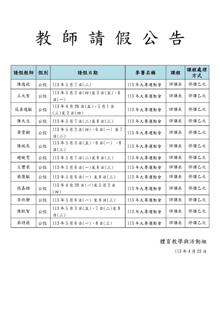 【停課通知-教師公假(陳逸政、王元聖、范姜逸敏、陳天文、黃貴樹、陳瑞辰、趙曉雯、王豐家、蔡慧敏、張嘉雄、李欣靜、陳凱智、吳詩薇)】 本組陳逸政教師、王元聖教師、范姜逸敏教師、陳天文教師、黃貴樹教師、陳瑞辰教師、趙曉雯教師、王豐家教師、蔡慧敏教師、張嘉雄教師、李欣靜教師、陳凱教師智、吳詩薇教師教師因帶隊出賽公假,比賽時間所授課程停課一次。(詳附檔)