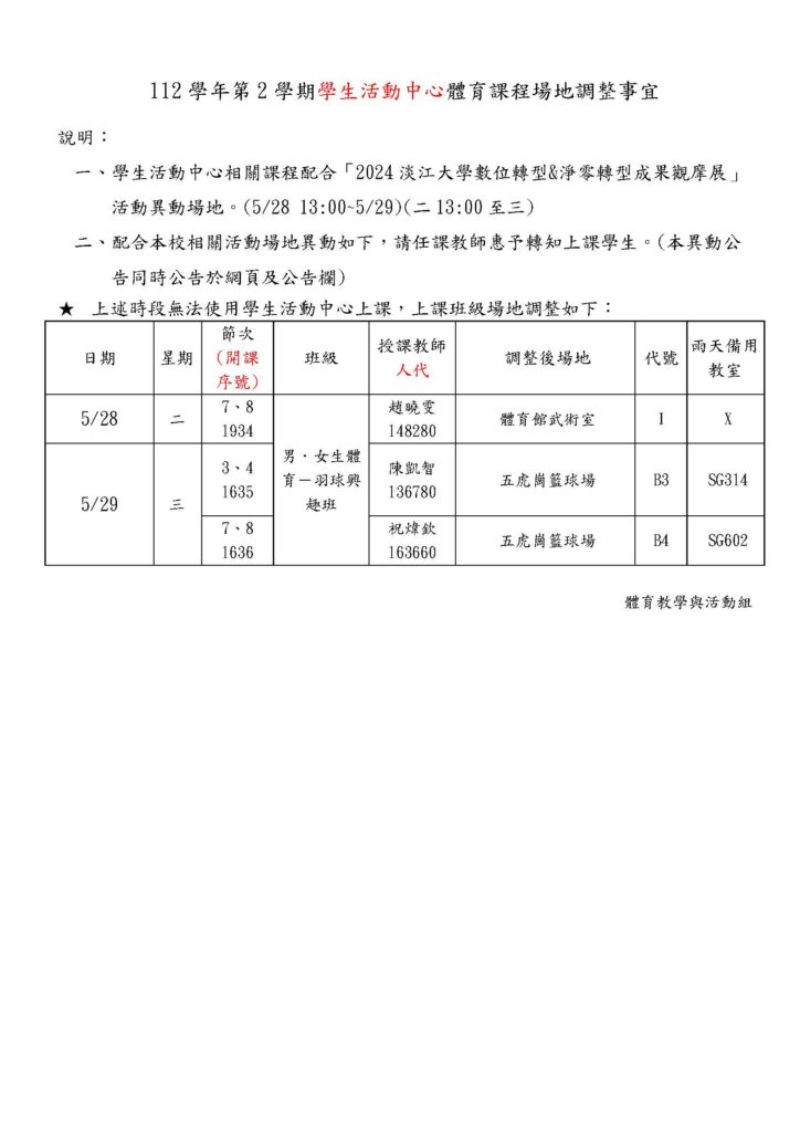一、學生活動中心相關課程配合「2024淡江大學數位轉型&淨零轉型成果觀摩展」活動異動場地。(5/28 13:00~5/29)(二13:00至三)