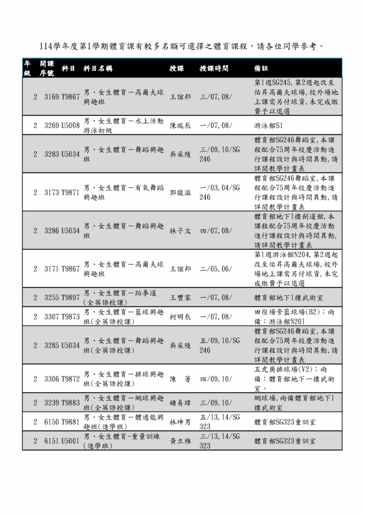 114學年度第1學期體育課有較多名額可選擇之體育課程,請各位同學參考。